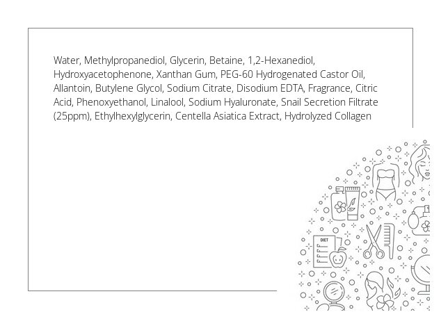 Maska w płachcie z ekstraktem ze śluzu ślimaka intensywnie nawilża skórę, przyspiesza odnowę komórkową, wspomaga gojenie ran, łagodzi stany zapalne i podrażnienia. Zawiera również ekstrakt z Centella asiatica i alantoine, które łagodzą, zmiękczają, chronią i wspomagają gojenie się skóry. Kolagen zapewnia silne działanie przeciwstarzeniowe, a skuteczne połączenie ekstraktu z nasion Chia i kwasu hialuronowego działa nawilżająco i kondycjonująco na skórę. zapewniając długotrwały efekt nawilżenia i zmiękczenia. Ta maska rewitalizuje, nabiera równomiernego kolorytu i ujędrnia.
