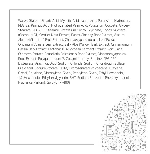 Oczyszczająca pianka nawilżająca, skutecznie usuwa resztki makijażu i inne wszelkiego rodzaju zanieczyszczenia. W składzie produktu znajdziemy między innymi śluz ślimaka, ekstrakty wodorostów i złota, kolagen, elastynę, kwas hialuronowy oraz witaminy A,E,C. Składniki te intesywnie odżywiają, nawilżają, koją i wygładzają skórę. Formuła została dodatkowo wzbogacona o ekstrakt żen-szenia, fito-mucynę, wyciąg z kory cynamonu i olej kokosowy.