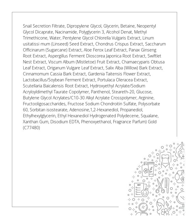 Regenerująco-nawilżająca esencja na bazie filtratu ze śluzu złotego ślimaka, ma lekką konsystencję, dzięki czemu szybko się wchłania. Wygładza drobne zmarszczki, zmiękcza skórę i wyrównuje jej koloryt. Mucyna ślimakowa pobudza produkcję kwasu hialuronowego i zmniejsza aktywność wolnych rodników, działa przeciwzapalnie, kojąco i eliminuje złuszczanie. Łagodzi i wygładza drobne zmarszczki. Zawartość wyciągu z aloesu i żeń-szenia, jemioły, oregano i portulaki ogrodowej wspomaga przeciwstarzeniowe działanie esencji. Produkt sprawi że skóra będzie zdrowa, jędrna i elastyczna.